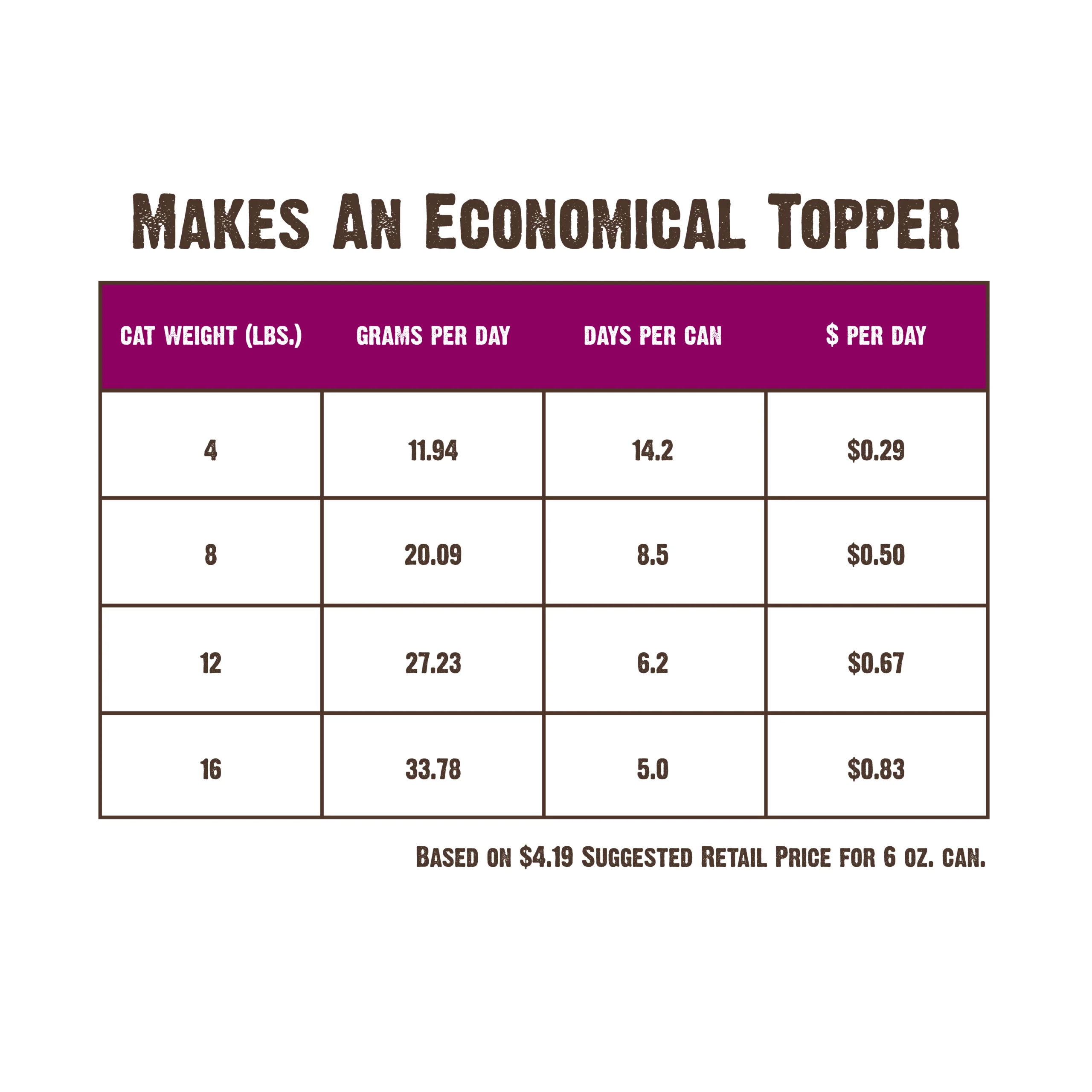 1,380 kcal/kg, 117 kcal/3 oz can, 238 kcal/6 oz can